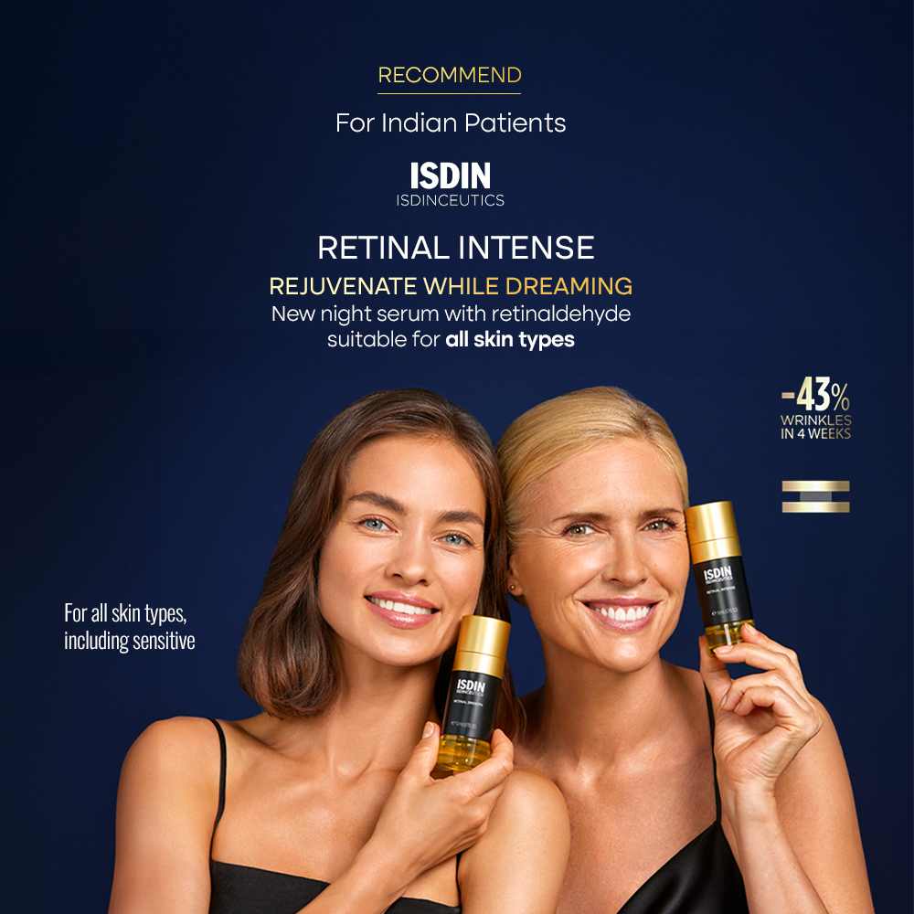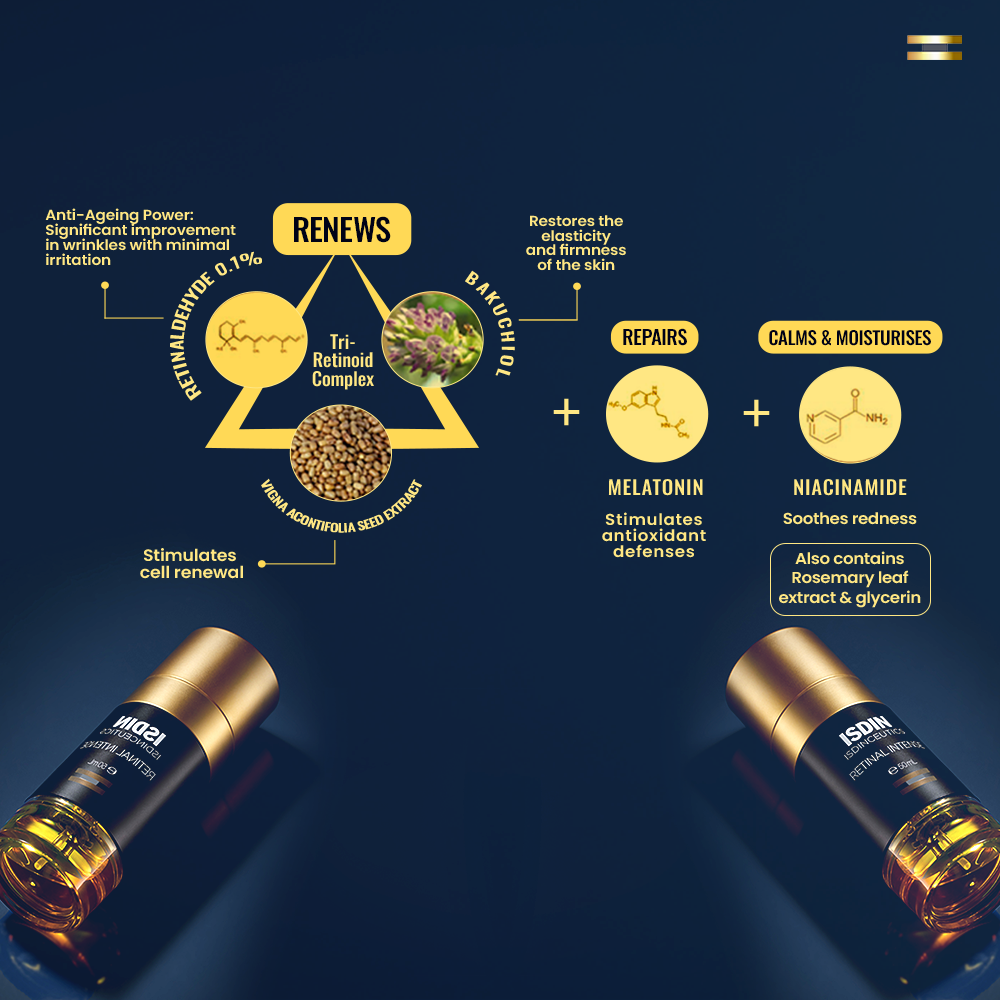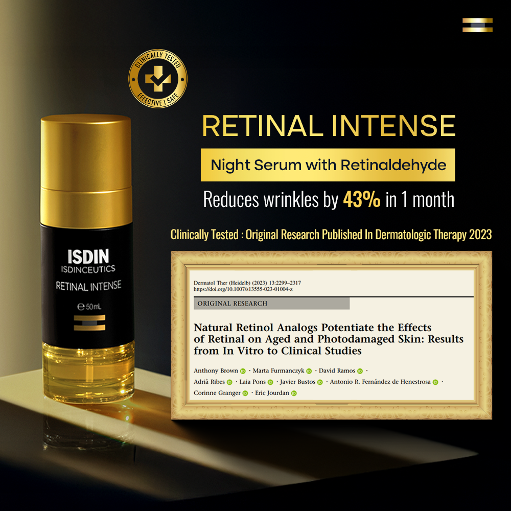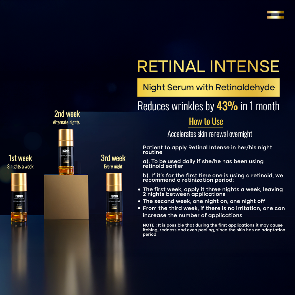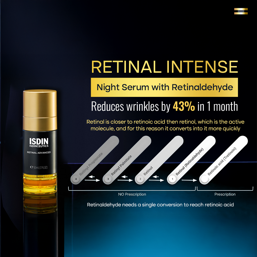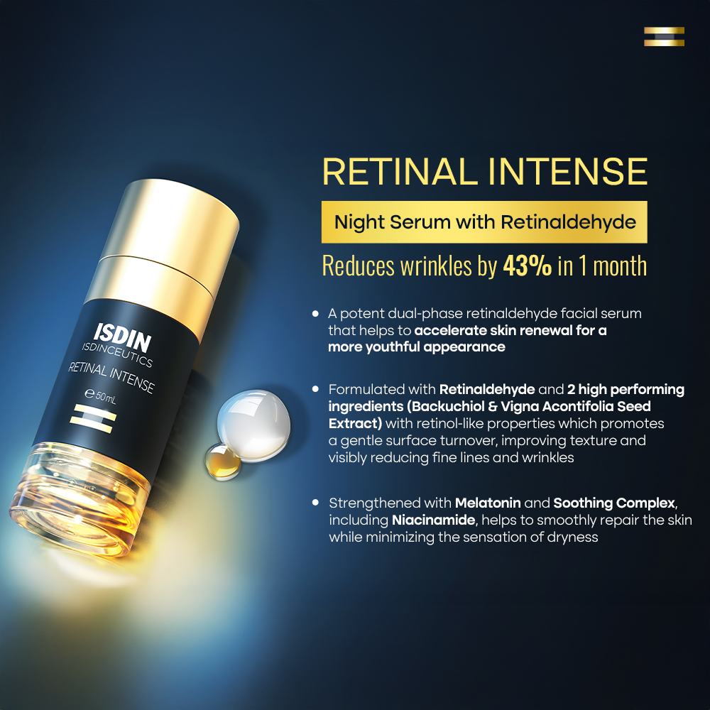 Isdin Retinal Intense Night Serum is a powerful dual-phase anti-aging treatment formulated with Retinaldehyde to visibly reduce wrinkles by up to 43% in just 1 month. This advanced night serum accelerates skin renewal while improving firmness, texture, and overall skin quality.
