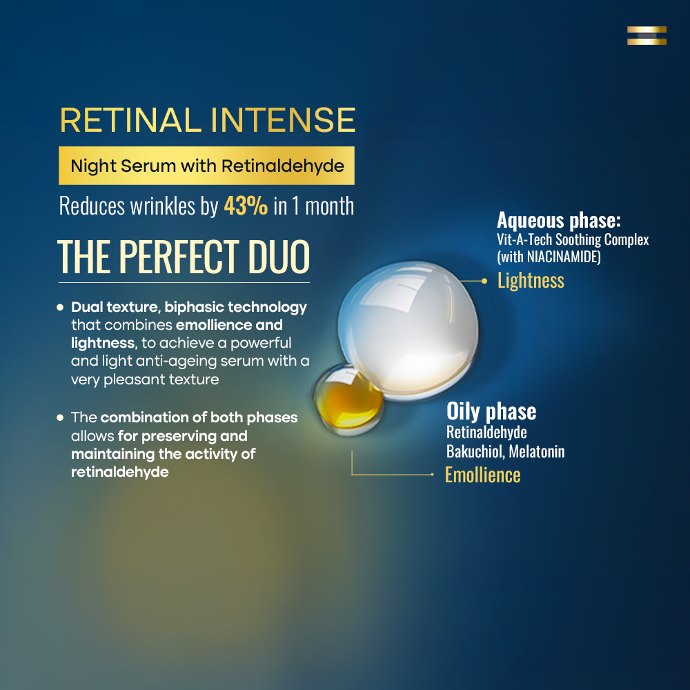Its innovative biphasic technology combines an aqueous soothing phase with an oil-based active phase to preserve the potency of retinaldehyde while delivering comfort and hydration. Strengthened with Melatonin, Niacinamide, Bakuchiol, and Vigna Aconitifolia Extract, it helps renew the skin overnight with minimal discomfort.