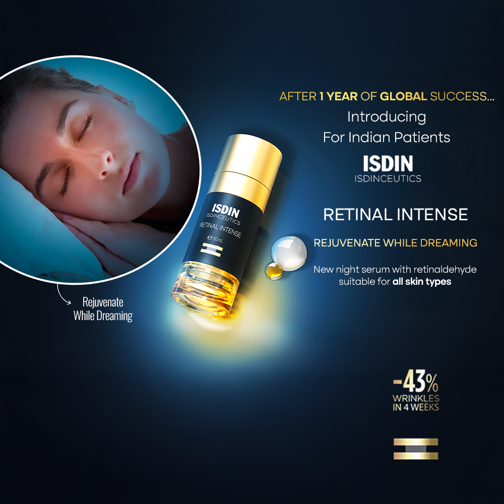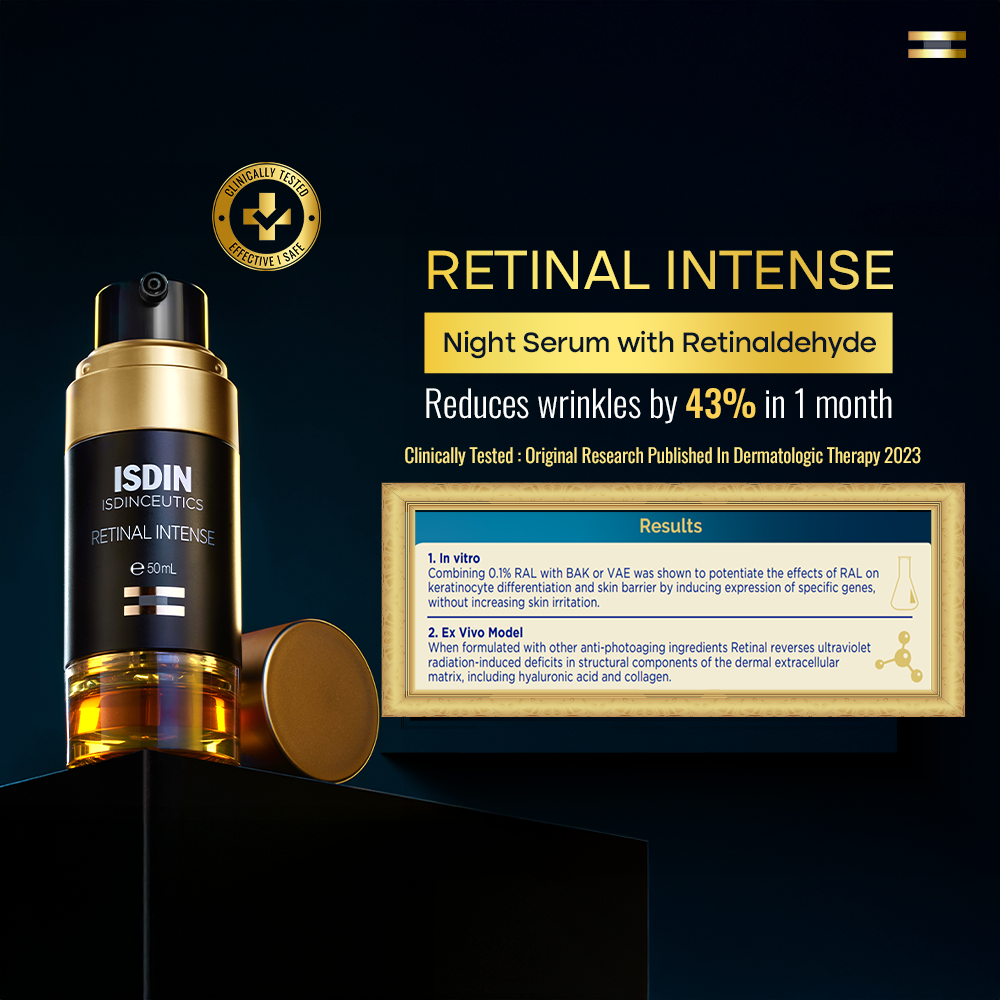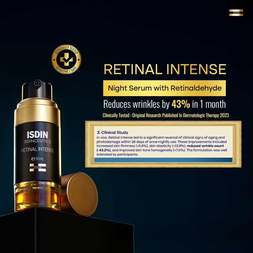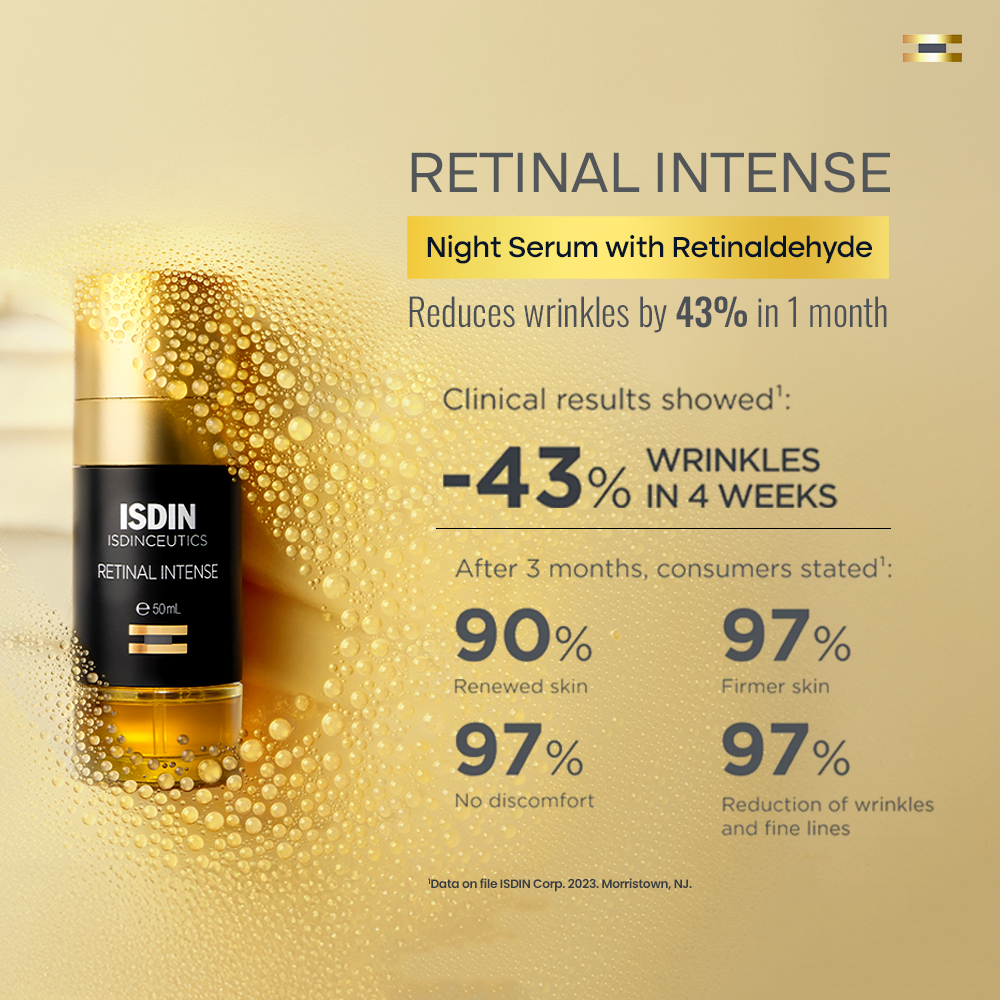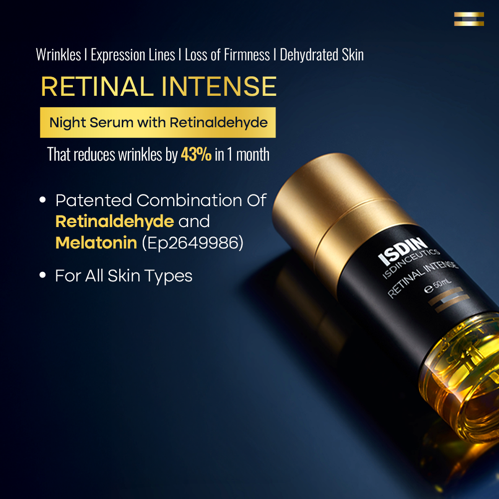 Isdin Retinal Intense Night Serum is a powerful dual-phase anti-aging treatment formulated with Retinaldehyde to visibly reduce wrinkles by up to 43% in just 1 month. This advanced night serum accelerates skin renewal while improving firmness, texture, and overall skin quality.